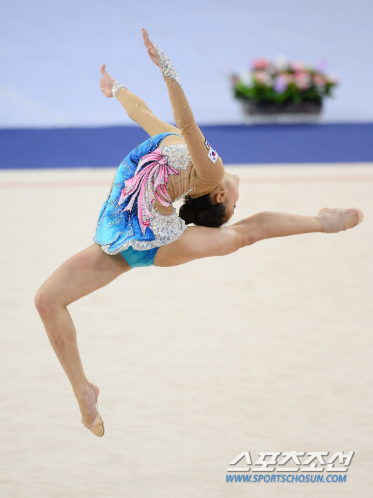 한국리듬체조대표팀 손연재가 1일 인천 남동체육관에서 열린 2014인천아시안게임 리듬체조 단체전에서 연기를 펼치고 있다.