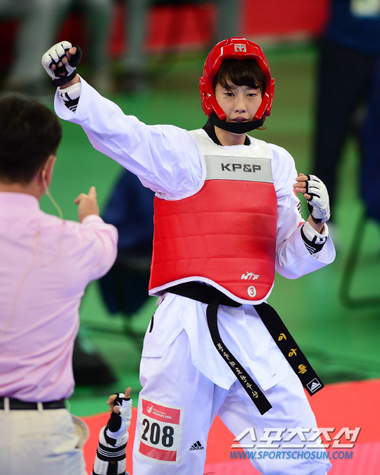 1일 오후 인천 강화고인돌경기장에서 2014 인천 아시안게임 태권도 여자 57kg 결승전이 열렸다. 공격에 성공한 한국 이아름이 기뻐하고 있다.