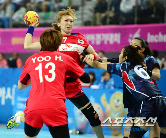 인천아시안게임 여자 핸드볼 한국과 일본의 결승전이 1일 인천 선학핸드볼경기장에서 열렸다. 한국 심해인이 슈팅을 시도하고 있다.