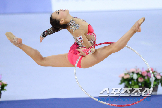 한국리듬체조대표팀 손연재가 1일 인천 남동체육관에서 열린 2014인천아시안게임 리듬체조 단체전에서 후프연기를 펼치고 있다.