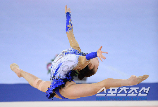 한국리듬체조대표팀 이다애가 1일 인천 남동체육관에서 열린 2014인천아시안게임 리듬체조 단체전에서 후프연기를 펼치고 있다.