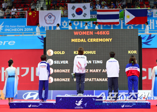 1일 오후 인천 강화고인돌경기장에서 2014 인천 아시안게임 태권도 여자 46kg 결승전이 열렸다. 금메달을 차지한 한국 김소희가 시상식에서 국기에 대한 경례를 하고 있다.
