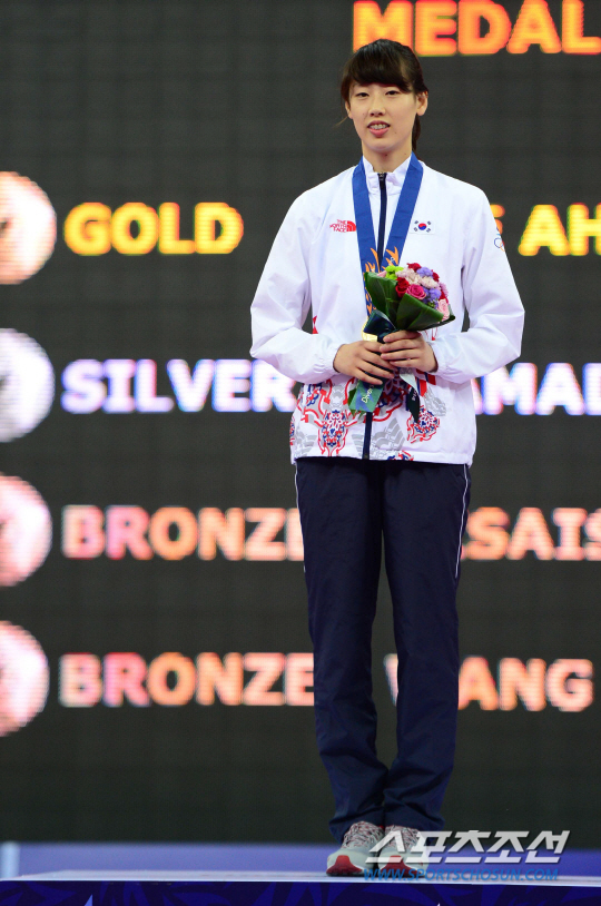 1일 오후 인천 강화고인돌경기장에서 2014 인천 아시안게임 태권도 여자 57kg 결승전이 열렸다. 금메달을 차지한 한국 이아름이 시상식에서 기뻐하고 있다.