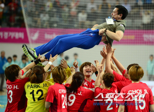 여자 핸드볼 대표팀이 일본을 대파하며 금메달을 차지했다. 인천아시안게임 여자 핸드볼 한국과 일본의 결승전이 1일 인천 선학핸드볼경기장에서 열렸다. 일본을 29-19로 꺾으며 금메달을 차지한 선수들이 임영철 감독을 헹가래치고 있다.