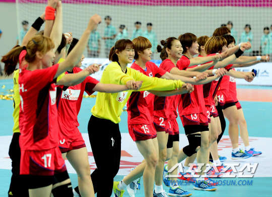 여자 핸드볼 대표팀이 일본을 대파하며 금메달을 차지했다. 인천아시안게임 여자 핸드볼 한국과 일본의 결승전이 1일 인천 선학핸드볼경기장에서 열렸다. 일본을 29-19로 꺾으며 금메달을 차지한 선수들이 환호하고 있다.