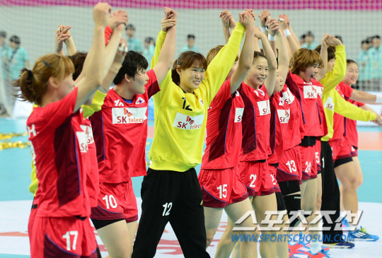 여자 핸드볼 대표팀이 일본을 대파하며 금메달을 차지했다. 인천아시안게임 여자 핸드볼 한국과 일본의 결승전이 1일 인천 선학핸드볼경기장에서 열렸다. 일본을 29-19로 꺾으며 금메달을 차지한 선수들이 환호하고 있다.