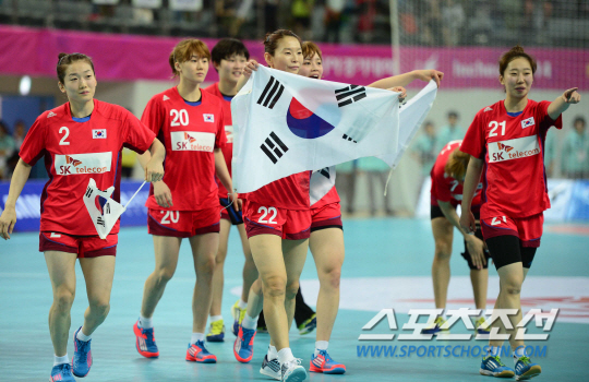 여자 핸드볼 대표팀이 일본을 대파하며 금메달을 차지했다. 인천아시안게임 여자 핸드볼 한국과 일본의 결승전이 1일 인천 선학핸드볼경기장에서 열렸다. 일본을 29-19로 꺾으며 금메달을 차지한 선수들이 환호하고 있다.
