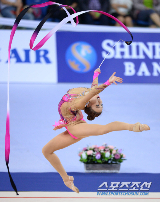 한국리듬체조대표팀 김윤희가 1일 인천 남동체육관에서 열린 2014인천아시안게임 리듬체조 단체전에서 리본연기를 펼치고 있다.
