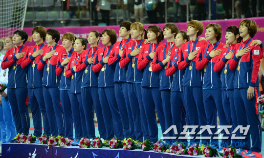 여자 핸드볼 대표팀이 일본을 대파하며 금메달을 차지했다. 인천아시안게임 여자 핸드볼 한국과 일본의 결승전이 1일 인천 선학핸드볼경기장에서 열렸다. 일본을 29-19로 꺾으며 금메달을 차지한 선수들이 애국가를 따라 부르며 감격스러워하고 있다.