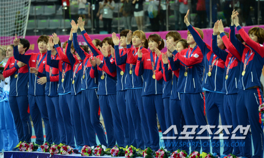 여자 핸드볼 대표팀이 일본을 대파하며 금메달을 차지했다. 인천아시안게임 여자 핸드볼 한국과 일본의 결승전이 1일 인천 선학핸드볼경기장에서 열렸다. 일본을 29-19로 꺾으며 금메달을 차지한 선수들이 애국가를 따라 부르며 감격스러워하고 있다.