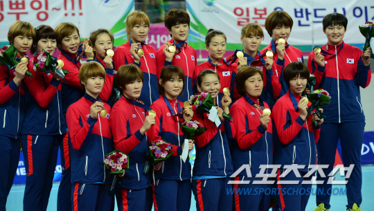 여자 핸드볼 대표팀이 일본을 대파하며 금메달을 차지했다. 인천아시안게임 여자 핸드볼 한국과 일본의 결승전이 1일 인천 선학핸드볼경기장에서 열렸다. 일본을 29-19로 꺾으며 금메달을 차지한 선수들이 포즈를 취하고 있다.