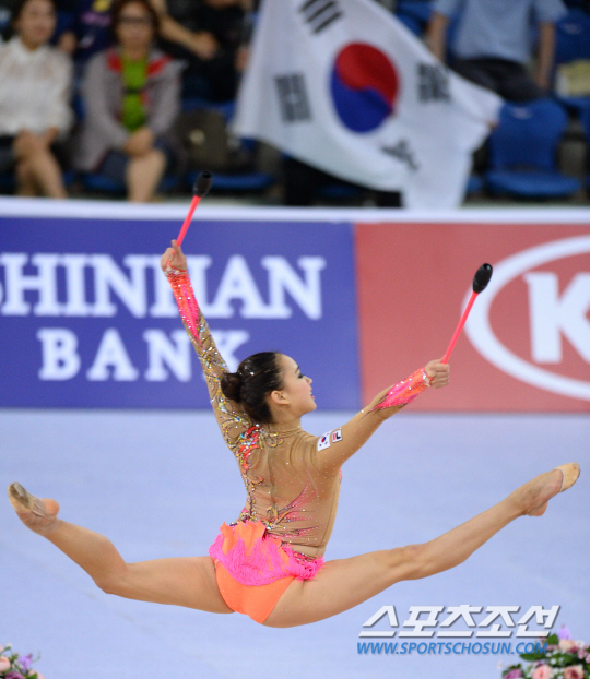 한국리듬체조대표팀 손연재가 1일 인천 남동체육관에서 열린 2014인천아시안게임 리듬체조 단체전에서 곤봉연기를 펼치고 있다.