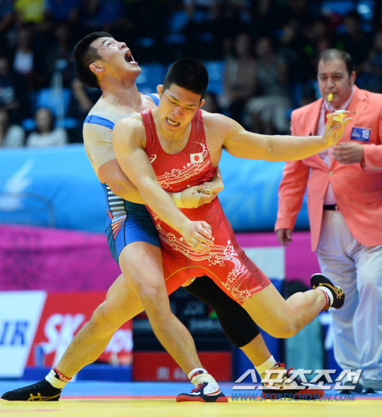 한국레슬링대표팀 이세열이 1일 인천 도원체육관에서 열린 2014인천아시안게임 남자레슬링 그레코로만형 85kg급 16강전에서 일본의 오카타이치에게 패시브 공격을 시도하고 있다. 인천=최문영 기자 deer@sportschosun.com /2014.10.01/