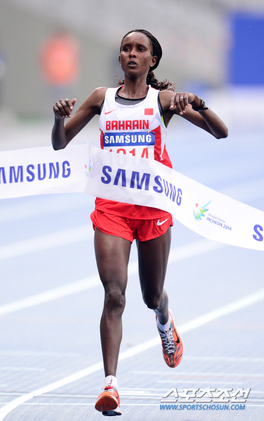 인천 아시안게임 여자마라톤 경기가 2일 열린 가운데 케냐 출신의 귀화 마라토너 에우니세 제키루이 키르와(바레인)가 결승선을 1위로 통과하고 있다. 인천 송도 센트럴파크 앞을 출발해 인천아시아드주경기장으로 들어오는 42.195km 레이스에서 키르와는 2시간 25분 37초의 기록으로 가장 먼저 결승선을 통과했다.