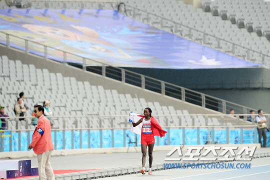 [AG포토] 텅 빈 주경기장, 갈채 못받은 女마라톤 우승자
