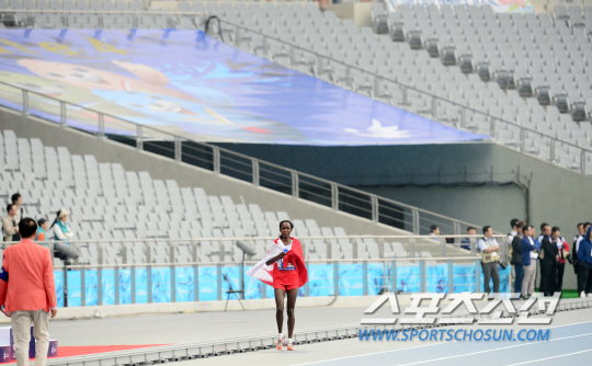 인천 아시안게임 여자마라톤 경기가 2일 열린 가운데 케냐 출신의 귀화 마라토너 에우니세 제키루이 키르와(바레인)가 결승선을 1위로 통과했다. 키르와가 바레인 국기를 두르고 트랙을 돌며 세리머니를 하고 있다.