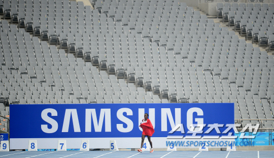 인천 아시안게임 여자마라톤 경기가 2일 열린 가운데 케냐 출신의 귀화 마라토너 에우니세 제키루이 키르와(바레인)가 결승선을 1위로 통과했다. 키르와가 바레인 국기를 두르고 트랙을 돌며 세리머니를 하고 있다.