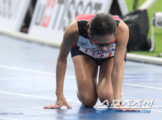 인천 아시안게임 여자마라톤 경기가 2일 열린 가운데 한국 김성은이 8위로 결승선을 통과한 후 쓰러지고 있다. 인천 송도 센트럴파크 앞을 출발해 인천아시아드주경기장으로 들어오는 42.195km 레이스에서 바레인의 키르와가 2시간 25분 37초의 기록으로 1위를 차지했다.
