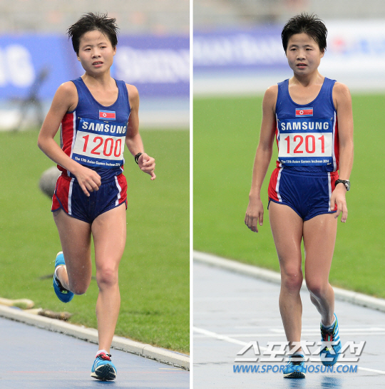 인천 아시안게임 여자마라톤 경기가 2일 열린 가운데 북한 쌍둥이 마라토너가 7위와 9위로 골인했다. 동생 김혜경(왼쪽)은 7위(2시간 36분38초), 언니 김혜성 9위(2시간 38분 55초)를 기록했다.
