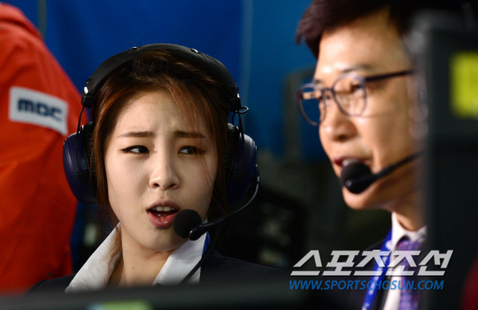 인천 아시안게임 리듬체조 개인종합 결승전이 2일 인천 남동체육관에서 열렸다. 김성주 아나운서와 함께 해설을 맡은 신수지가 경기 시작 전 김성주 아나운서와 이야기를 나누고 있다.