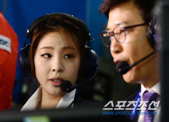 인천 아시안게임 리듬체조 개인종합 결승전이 2일 인천 남동체육관에서 열렸다. MBC 해설위원 신수지가 경기 시작 전 김성주 아나운서와 이야기를 나누고 있다.