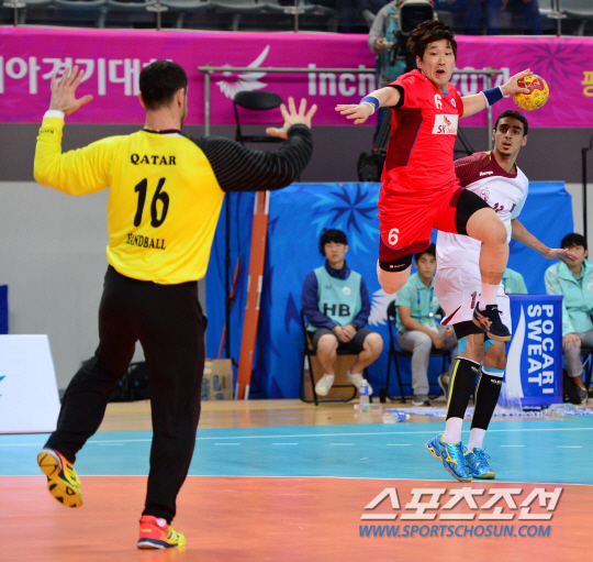 2일 오후 인천 선학핸드볼경기장 2014 인천 아시안게임 핸드볼 남자 결승 한국과 카타르의 경기가 열렸다. 한국 유동근이 팀의 첫 골을 성공시키고 있다.