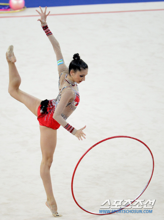 인천 아시안게임 리듬체조 개인종합 결승전이 2일 인천 남동체육관에서 열렸다. 우즈베키스탄 라크마토바가 후프 연기를 펼치고 있다.