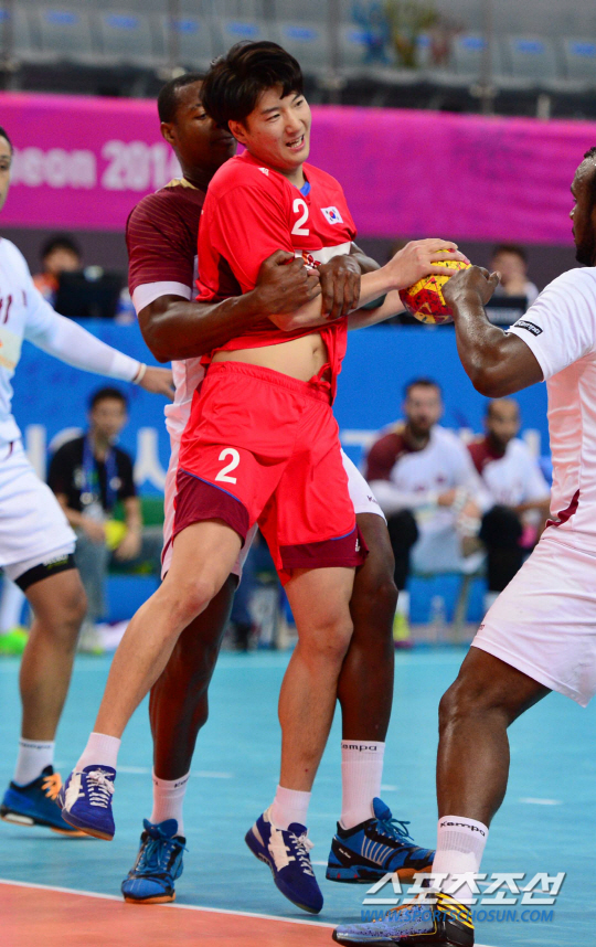 2일 오후 인천 선학핸드볼경기장 2014 인천 아시안게임 핸드볼 남자 결승 한국과 카타르의 경기가 열렸다. 한국 정의경이 카타르의 수비에 막히고 있다.