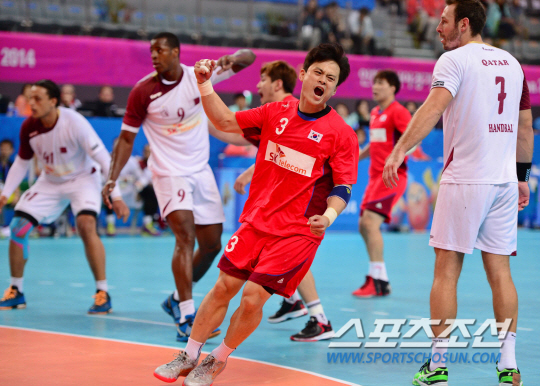 2일 오후 인천 선학핸드볼경기장 2014 인천 아시안게임 핸드볼 남자 결승 한국과 카타르의 경기가 열렸다. 골을 성공시킨 한국 심재복이 환호하고 있다.