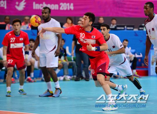 2일 오후 인천 선학핸드볼경기장 2014 인천 아시안게임 핸드볼 남자 결승 한국과 카타르의 경기가 열렸다. 한국 이상욱이 골을 성공시키고 있다.