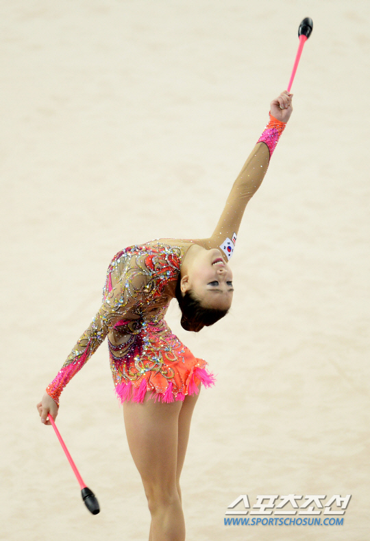 인천 아시안게임 리듬체조 개인종합 결승전이 2일 인천 남동체육관에서 열렸다. 손연재가 곤봉 연기를 펼치며 관중을 매혹시키고 있다.