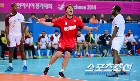 2일 오후 인천 선학핸드볼경기장 2014 인천 아시안게임 핸드볼 남자 결승 한국과 카타르의 경기가 열렸다. 한국 박중규가 골을 성공시킨 후 환호하고 있다.