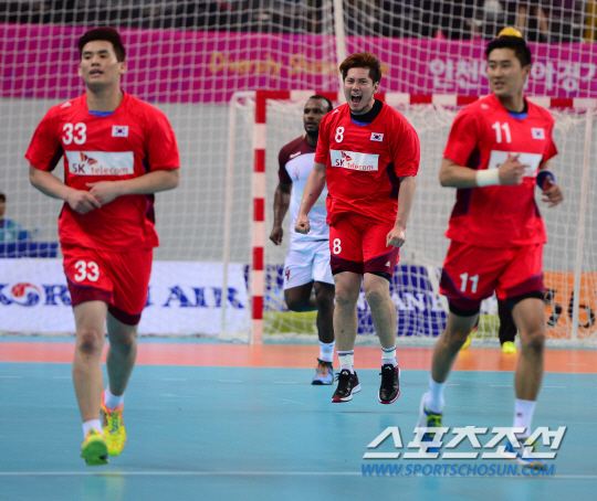 2일 오후 인천 선학핸드볼경기장 2014 인천 아시안게임 핸드볼 남자 결승 한국과 카타르의 경기가 열렸다. 한국 박중규가 골을 성공시킨 후 환호하고 있다.