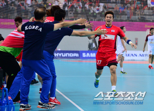 2일 오후 인천 선학핸드볼경기장 2014 인천 아시안게임 핸드볼 남자 결승 한국과 카타르의 경기가 열렸다. 한국 이은호가 골을 성공시킨 후 환호하고 있다.