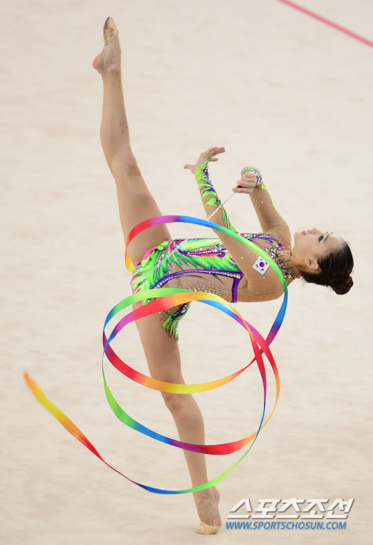 인천 아시안게임 리듬체조 개인종합 결승전이 2일 인천 남동체육관에서 열렸다. 한국 손연재가 리본 연기를 펼치며 관중을 매혹시키고 있다.