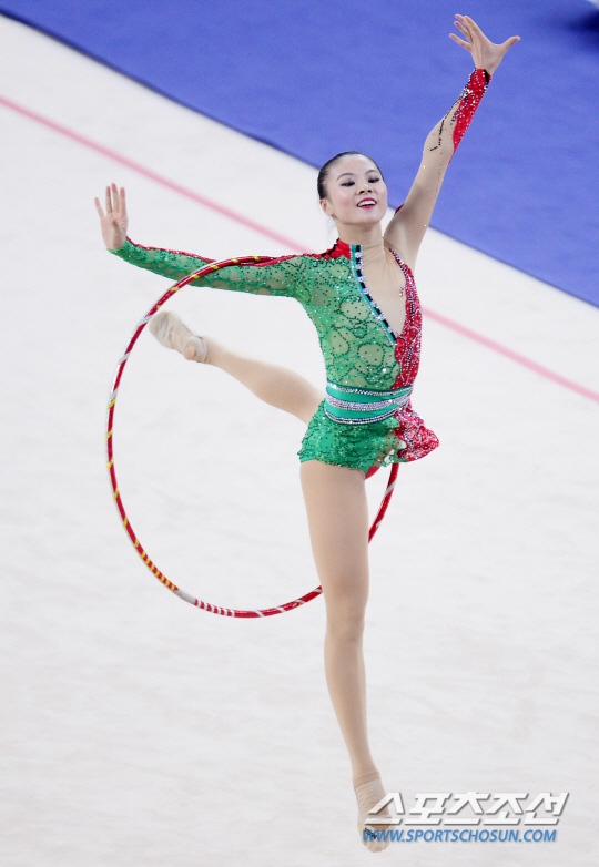인천 아시안게임 리듬체조 개인종합 결승전이 2일 인천 남동체육관에서 열렸다. 중국 덩센위에가 후프 연기를 펼치며 관중을 매혹시키고 있다.