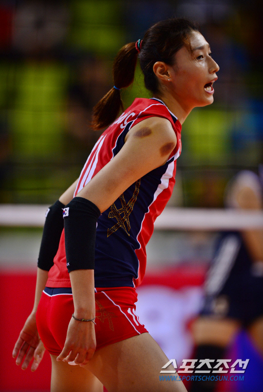 2일 오후 인천 송림체육관에서 2014 인천 아시안게임 배구 여자 결승 한국과 중국의 경기가 열렸다. 어깨에 부항을 한 김연경이 경기를 하고 있다.
