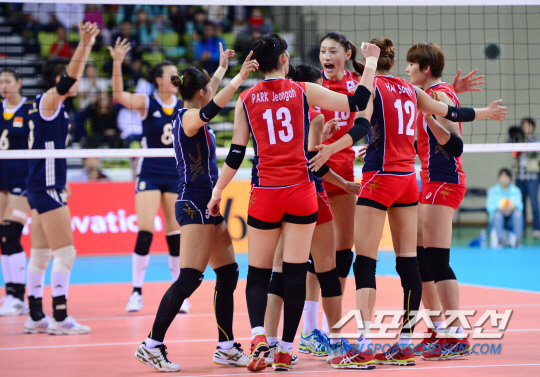 2일 오후 인천 송림체육관에서 2014 인천 아시안게임 배구 여자 결승 한국과 중국의 경기가 열렸다. 공격을 성공시킨 한국 선수들이 환호하고 있다.