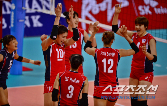 2일 오후 인천 송림체육관에서 2014 인천 아시안게임 배구 여자 결승 한국과 중국의 경기가 열렸다. 공격을 성공시킨 한국 선수들이 환호하고 있다.