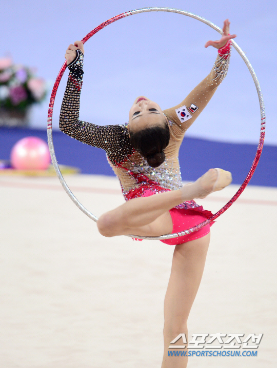 인천 아시안게임 리듬체조 개인종합 결승전이 2일 인천 남동체육관에서 열렸다. 손연재가 후프 연기를 펼치며 관중을 매혹시키고 있다.