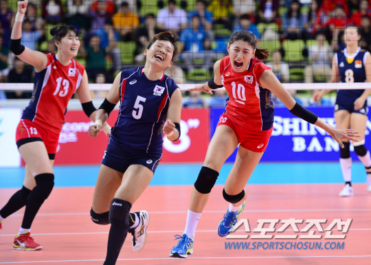 2일 오후 인천 송림체육관에서 2014 인천 아시안게임 배구 여자 결승 한국과 중국의 경기가 열렸다. 공격을 성공시킨 한국 김연경이 환호하고 있다.