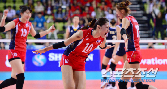 2일 오후 인천 송림체육관에서 2014 인천 아시안게임 배구 여자 결승 한국과 중국의 경기가 열렸다. 공격을 성공시킨 한국 김연경이 환호하고 있다.