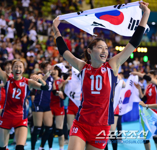 2일 오후 인천 송림체육관에서 2014 인천 아시안게임 배구 여자 결승 한국과 중국의 경기가 열렸다. 중국을 꺽고 금메달을 차지한 한국 김연경이 태극기를 휘날리며 기뻐하고 있다.
