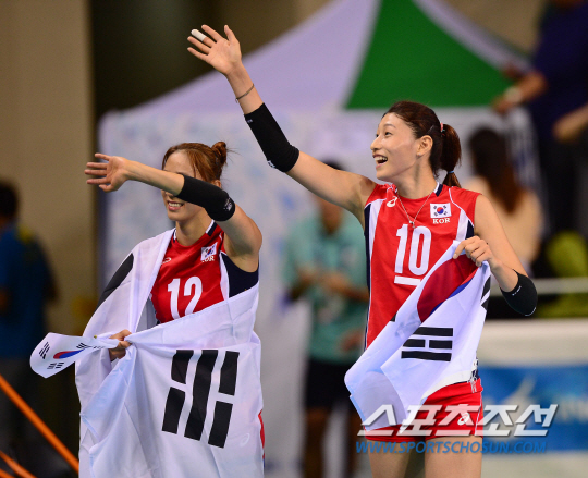 2일 오후 인천 송림체육관에서 2014 인천 아시안게임 배구 여자 결승 한국과 중국의 경기가 열렸다. 중국을 꺽고 금메달을 차지한 한국 김연경이 관중석을 향해 손을 흔들고 있다.