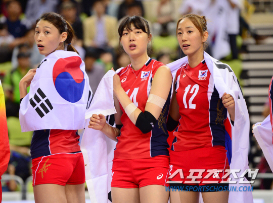 2일 오후 인천 송림체육관에서 2014 인천 아시안게임 배구 여자 결승 한국과 중국의 경기가 열렸다. 중국을 꺽고 금메달을 차지한 한국 김연경이 시상대 위에서 코칭스텝에게 태극기를 방향을 물어보고 있다.