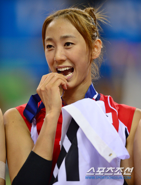 2일 오후 인천 송림체육관에서 2014 인천 아시안게임 배구 여자 결승 한국과 중국의 경기가 열렸다. 중국을 꺽고 금메달을 차지한 한국 한송이가 시상대 위에서 기뻐하고 있다.