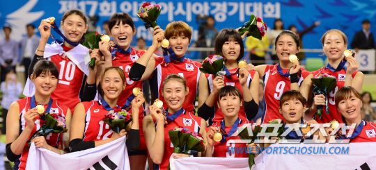2일 오후 인천 송림체육관에서 2014 인천 아시안게임 배구 여자 결승 한국과 중국의 경기가 열렸다. 중국을 꺽고 금메달을 차지한 한국 선수들이 시상대 위에서 기뻐하고 있다.