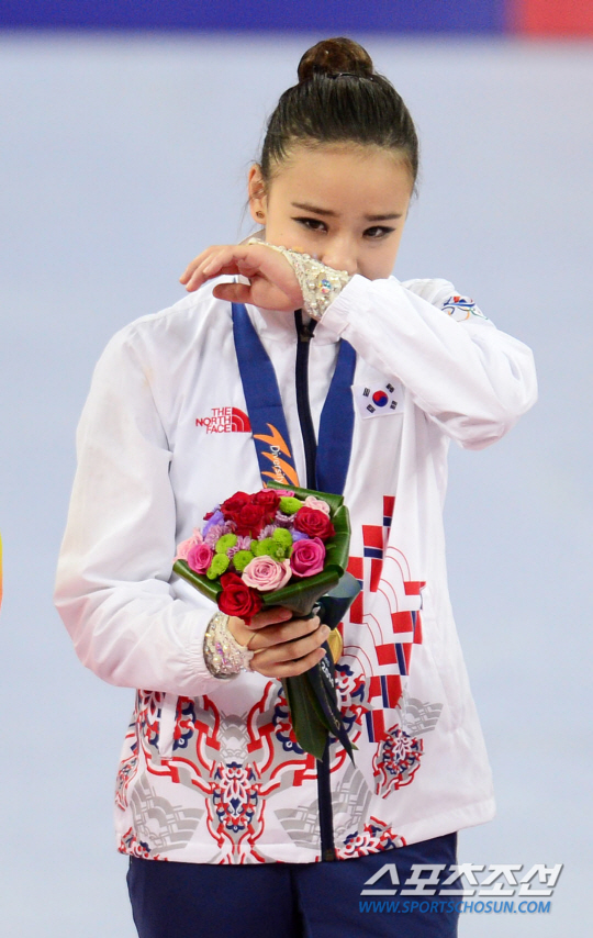 손연재가 마침내 첫 금메달을 목에 걸었다. 인천 아시안게임 리듬체조 개인종합 결승전이 2일 인천 남동체육관에서 열렸다. 금메달을 목에 건 손연재가 시상식에서 국기가 게양되자 눈물을 글썽인 후 손으로 닦고 있다.