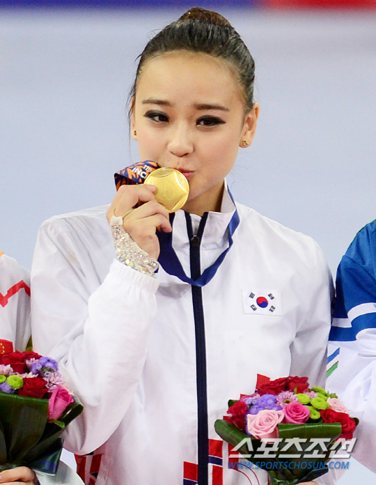 손연재가 마침내 첫 금메달을 목에 걸었다. 인천 아시안게임 리듬체조 개인종합 결승전이 2일 인천 남동체육관에서 열렸다. 우승을 차지한 손연재가 시상식에서 금메달에 입을 맞추고 있다.