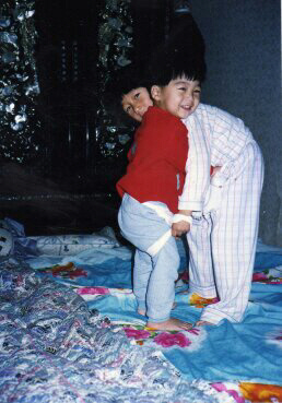 1991년 강원도 원주의 집에서 형인 김민우씨(오른쪽, 당시 6세)와 씨름을 하고 있는 김현우(당시 3세). 사진제공=김현우
